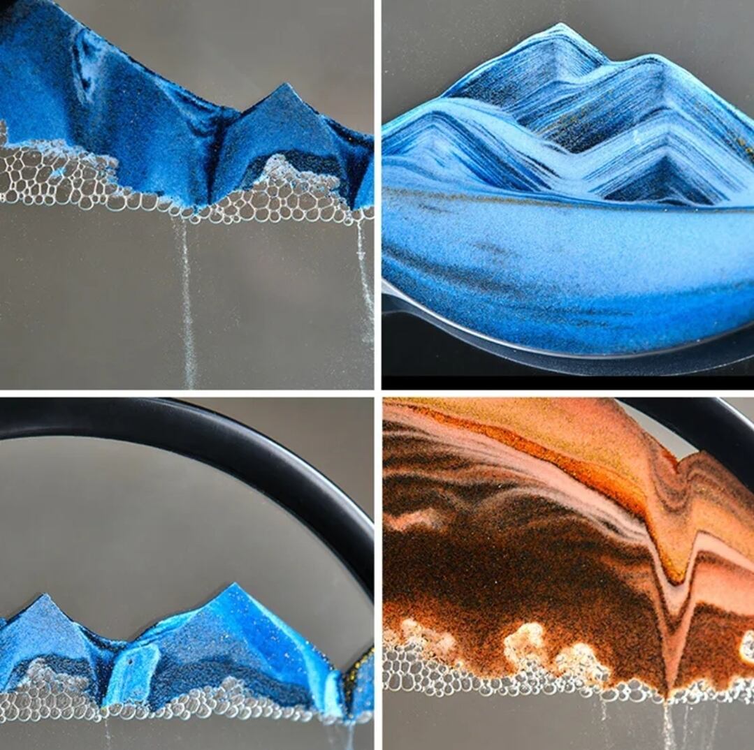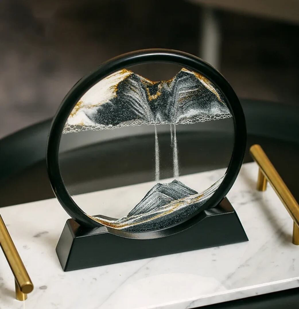ひとつひとつ手作りされた水と砂と硝子の工芸品。水の流れが砂を模しており、まるで風景が動いているような美しさが特徴です。職人の技術と緻密な計算によって作り出されたこの置き物は、美しいインテリアの一部としてお部屋に飾られることで、空間にぬくもりと奥行きを与えます。